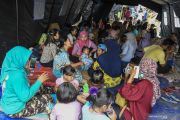 Sejumlah warga mengungsi di tenda darurat pascakebakaran di kawasan Balimester, Jatinegara, Jakarta, Sabtu (21/9/2019). Kebakaran yang terjadi pada Sabtu (21/9/2019) dini hari tersebut menghanguskan 129 rumah, diduga terjadi akibat hubungan pendek (korsleting) arus listrik. ANTARA FOTO/Galih Pradipta/wsj.