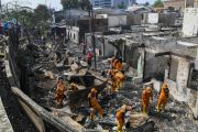 Petugas membersihkan puing-puing sisa kebakaran di kawasan Balimester, Jatinegara, Jakarta, Sabtu (21/9/2019). Kebakaran yang terjadi pada Sabtu (21/9/2019) dini hari tersebut menghanguskan 129 rumah, diduga terjadi akibat hubungan pendek (korsleting) arus listrik. ANTARA FOTO/Galih Pradipta/wsj