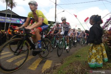 Pebalap memacu sepedanya ditanjakan Gunung Ijen pada etape keempat Kejuaraan Internasional Tour de Banyuwangi Ijen (ITdBI) 2019 di Banyuwangi, Jawa Timur, Sabtu (28/9/2019). Etape keempat ITdBI 2019 menempuh jarak 129,9 kilometer dimulai dari Pasar Purwoharjo dan finis di Paltuding, Gunung Ijen. ANTARA FOTO/Budi Candra Setya/wsj.