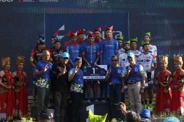 Pebalap sepeda Team UKYO Robbie Hucker (tengah) menjadi yang terbaik pada gelaran International Tour de Banyuwangi Ijen (ITdBI) 2019 di Banyuwangi, Jawa Timur, Sabtu (28/9/2019). Robbie Hucker berhasil memenangi kategori Juara Umum Individu pada ITdBI 2019 yang menempuh jarak 520,6 kilometer dengan waktu 13 jam 5 menit 32 detik. ANTARA FOTO/Budi Candra Setya/wsj.