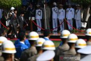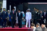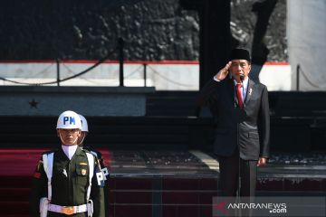 Presiden Joko Widodo memberi hormat saat memimpin upacara peringatan Hari Kesaktian Pancasila di Monumen Pancasila, Jakarta, Selasa (1/10/2019). Peringatan Hari Kesaktian Pancasila 2019 mengangkat tema Pancasila sebagai Dasar Penguatan Karakter Bangsa Menuju Indonesia Maju dan Bahagia. ANTARA FOTO/Wahyu Putro A/pras.
