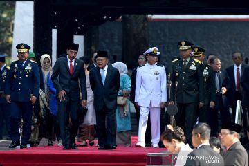 Presiden Joko Widodo (kiri) didampingi Wakil Presiden Jusuf Kalla menghadiri upacara peringatan Hari Kesaktian Pancasila di Monumen Pancasila, Jakarta, Selasa (1/10/2019). Peringatan Hari Kesaktian Pancasila 2019 mengangkat tema Pancasila sebagai Dasar Penguatan Karakter Bangsa Menuju Indonesia Maju dan Bahagia. ANTARA FOTO/Wahyu Putro A/pras.