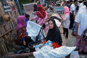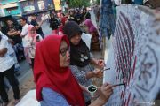 Sejumlah perajin membatik saat 'Pranggok On The Street' di pinggir Jalan Hayam Wuruk, Pekalongan, Jawa Tengah, Rabu (2/10/2019). Perkumpulan Kampung Batik Kauman mengadakan Pranggok On The Street atau proses produksi batik di jalan dengan tujuan untuk melestarikan batik dan sebagai wadah untuk mencari generasi penerus perajin batik. ANTARA FOTO/Harviyan Perdana Putra/ama.