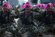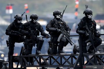 Prajurit Kopaska TNI AL berada di atas kendaraan tempur dalam Gladi Bersih HUT Ke-74 TNI di Lanud Halim Perdanakusuma, Jakarta TImur, Kamis (3/10/2019). HUT Ke-74 TNI akan diperingati pada Sabtu 5 Oktober 2019 dengan mengangkat tema TNI Profesional Kebanggaan Rakyat. ANTARA FOTO/Sigid Kurniawan/hp.