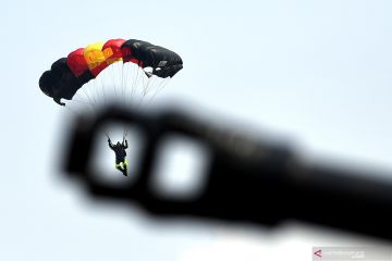 Penerjun beraksi pada Gladi Bersih HUT Ke-74 TNI di Lanud Halim Perdanakusuma, Jakarta TImur, Kamis (3/10/2019). HUT Ke-74 TNI akan diperingati pada Sabtu 5 Oktober 2019 dengan mengangkat tema TNI Profesional Kebanggaan Rakyat. ANTARA FOTO/Sigid Kurniawan/hp.