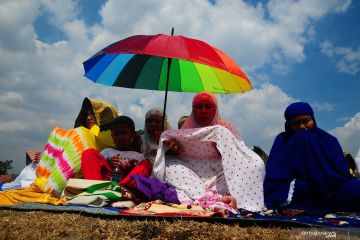 Umat Islam berdoa usai melaksanakan shalat Istisqa atau shalat minta hujan di lapangan Desa Kuwu, Kradenan, Grobogan, Jawa Tengah, Kamis (3/10/2019). Sholat itu untuk meminta hujan agar bencana kekeringan yang melanda wilayah setempat sejak lima bulan terakhir dan sejumlah wilayah di Indonesia segera berakhir. ANTARA FOTO/Yusuf Nugroho/pras.