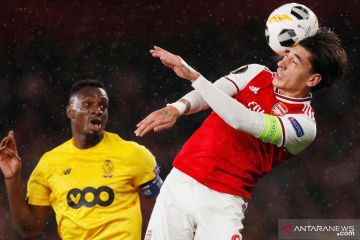 Pesepak bola Arsenal Hector Bellerin (kanan) menyundul bola dijaga pesepak bola Standard Liege Paul-Jose M'Poku dalam laga Group F Liga Champions, di Stadion Emirates, London, Inggris, Kamis (3/10/2019). Arsenal berhasil membungkam tamunya 4-0 dan Martinelli menyumbang dua gol untuk timnya dalam pertandingan ini. ANTARA FOTO/Reuters-David Klein/hp.