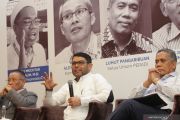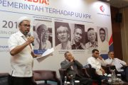 Anggota DPR Fraksi PKS Nasir Jamil (tengah) bersama Guru Besar Ilmu Hukum Universitas Padjajaran Romli Atmasasmita (kiri) dan Ketua Umum Peradi Luhut Pangaribuan (kanan) menjadi pembicara dalam Diskusi Sikap Pemerintah Terhadap UU KPK di Jakarta, Jumat (4/10/2019). Diskusi yg dihadiri pengamat, praktisi hukum, perwakilan partai dan masyarakat umum ini ingin memberikan masukan kepada pemerintah atas UU KPK yang telah disetujui oleh DPR. ANTARA FOTO/Reno Esnir/nz.