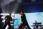 Grup Band Dewa 19 bersama vokalis Once Mekel (kanan) dan pemain kibor Dul Jaelani tampil menghibur penonton pada konser "The Best of Dewa 19 with Once Mekel" di The Kasablanka Hall, Jakarta, Jumat (4/10/2019). Konser tersebut membawakan 20 judul lagu yang menghibur para penggemarnya. ANTARA FOTO/Reno Esnir/wsj.