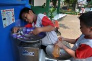 Pelajar SD mengisi botol minumnya di Kran Air Siap Minum, Taman Sempur, Kota Bogor, Jawa Barat, Senin (7/10/2019). Pemerintah Kota Bogor melalui Perusahaan Daerah Air Minum (PDAM) Tirta Pakuan Bogor menyediakan fasilitas Kran Air Siap Minum di ruang terbuka publik selain untuk mempermudah warga menikmati air minum juga untuk mengurangi penggunaan botol dan gelas plastik. ANTARA FOTO/Arif Firmansyah/hp.