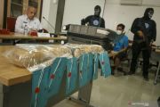 Petugas menunjukkan barang bukti sabu - sabu saat gelar perkara penyeludupan narkoba di Kantor Angkasa Pura I Bandara Adisutjipto, Sleman, DI Yogyakarta, Senin (7/10/2019). Pihak otoritas Bandara Adisutjipto berhasil menggagalkan penyelundupan sabu-sabu berat 5.506,4 gram dengan senilai Rp5 miliar melalui penerbangan SJ 712 dari Lampung menuju Makassar yang transit di Yogyakarta. ANTARA FOTO/Hendra Nurdiyansyah/hp.
