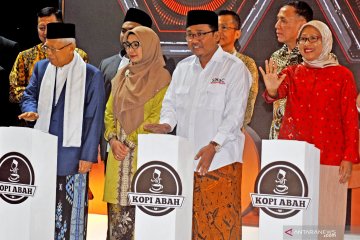Wakil Presiden terpilih periode 2019-2024 Ma'ruf Amin (kiri), Direktur Sales Telkomsel Ririn Widaryani (kanan) dan Presiden Direktur Simac Gus Nur Rahman (tengah), bersiap menekan tombol saat peluncuran aplikasi Kopi Abah di Jakarta, Rabu (9/10/2019). Telkomsel berkolaborasi dengan Santri Milenial Center (Simac), melalui pemanfaatan Creative Millennials sebagai salah satu program Corporate Social Responsibility (CSR) Telkomsel yang memberikan pelatihan digital dan edukasi kewirausahaan berbasis pemanfaatan teknologi digital untuk pengusaha muda di Indonesia.ANTARA FOTO/Audy Alwi/ama.