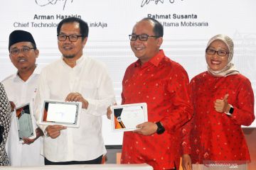 Direktur Sales Telkomsel Ririn Widaryani (kanan), menyaksikan Senior Vice President Corporate Secretary Telkomsel Muharam Perbawamukti (kedua kanan), Direktur Utama LPDB - KUMKM Braman Setyo (kedua kiri) dan Presiden Direktur Simac Gus Nur Rahman, menandatangani naskah kolaborasi Telkomsel dengan Santri Milenial Center (Simac), saat peluncuran aplikasi Kopi Abah, di Jakarta, Rabu (9/10/2019). Telkomsel berkolaborasi dengan Santri Milenial Center (Simac), melalui pemanfaatan Creative Millennials sebagai salah satu program Corporate Social Responsibility (CSR) Telkomsel yang memberikan pelatihan digital dan edukasi kewirausahaan berbasis pemanfaatan teknologi digital untuk pengusaha muda di Indonesia.ANTARA FOTO/Audy Alwi/ama.