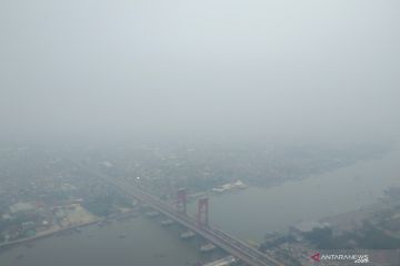 Foto udara kawasan Kota Palembang yang tertutup kabut asap, Sumatera Selatan, Jumat (11/10/2019). Sejumlah wilayah di Palembang masih diselimuti kabut asap dampak dari kebakaran hutan dan lahan yang terjadi di sejumlah di kawasan di Sumatera Selatan. ANTARA FOTO/Nathan/Lmo/hp.