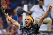 Ekspresi petenis putra Yunani Stefanos Tsitsipas seusai mengalahkan petenis Serbia Novak Djokovic saat pertandingan perempat final turnamen Shanghai Masters di Qi Zhong Tennis Center, Shanghai, China, Jumat (11/10/2019). Djokovic kalah dengan tiga set 6-3, 5-7, 3-6. ANTARA FOTO/REUTERS/Aly Song/aww.