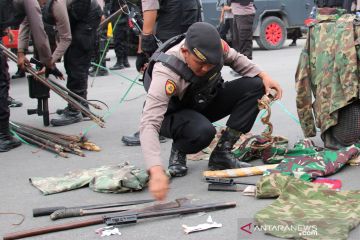Petugas kepolisian menyita sejumlah atribut dan senjata tajam ketika membongkar Markas Komite Nasional Papua Barat (KNPB) di Timika, Papua, Senin (14/10/2019). Polisi membongkar bangunan yang diduga sebagai tempat aktivitas organisasi terlarang dengan mengamankan sejumlah atribut dan senjata tajam dari lokasi tersebut. ANTARA FOTO/Sevianto Pakiding/wpa/hp.