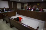 Terdakwa kasus ujaran kebencian Ina Yuniarti melakukan sujud syukur usai menjalani sidang pembacaan putusan di Pengadilan Negeri Jakarta Pusat, Senin (14/10/2019). Majelis Hakim memvonis bebas Ina Yuniarti karena tidak terbukti menyebarkan video dengan konten seorang pria berinisial HS mengancam akan memenggal kepala Presiden Joko Widodo yang direkam saat mengikuti unjuk rasa 21-22 Mei 2019 di depan gedung Bawaslu. ANTARA FOTO/Dhemas Reviyanto/wsj.