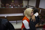 Terdakwa kasus ujaran kebencian Ina Yuniarti memeluk putrinya usai menjalani sidang pembacaan putusan di Pengadilan Negeri Jakarta Pusat, Senin (14/10/2019). Majelis Hakim memvonis bebas Ina Yuniarti karena tidak terbukti menyebarkan video dengan konten seorang pria berinisial HS mengancam akan memenggal kepala Presiden Joko Widodo yang direkam saat mengikuti unjuk rasa 21-22 Mei 2019 di depan gedung Bawaslu. ANTARA FOTO/Dhemas Reviyanto/wsj.
