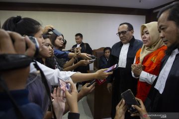 Terdakwa kasus ujaran kebencian Ina Yuniarti (kedua kanan) menjawab pertanyaan awak media usai menjalani sidang pembacaan putusan di Pengadilan Negeri Jakarta Pusat, Senin (14/10/2019). Majelis Hakim memvonis bebas Ina Yuniarti karena tidak terbukti menyebarkan video dengan konten seorang pria berinisial HS mengancam akan memenggal kepala Presiden Joko Widodo yang direkam saat mengikuti unjuk rasa 21-22 Mei 2019 di depan gedung Bawaslu. ANTARA FOTO/Dhemas Reviyanto/wsj.