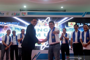 Direktur Bisnis PLN Regional Sulawesi Syamsul Huda (keempat kanan) memberikan selamat kepada perwakilan karyawan pada peluncuran program unggulan Perusahaan Listrik Negara (PLN) regional Sulawesi di Kota Gorontalo, Gorontalo, Jumat (18/10/2019). Program unggulan PLN tersebut yaitu Yantek EAM, Kota Sejuta Cahaya, KAM RAM serta Toraja Spirit Competition yang bertujuan meningkatkan kualitas pelayanan kepada pelanggan. ANTARA FOTO/Adiwinata Solihin/hp.