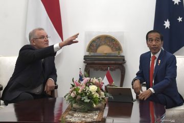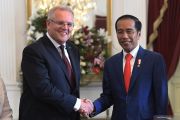 Presiden Joko Widodo (kanan) berjabat tangan dengan Perdana Menteri Australia Scott Morrison dalam kunjungan kehormatan di Istana Merdeka, Jakarta, Minggu (20/10/2019). ANTARA FOTO/Puspa Perwitasari/pras.
