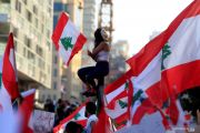 Seorang demonstran duduk di atas tiang sambil membawa bendera nasional selama protes anti-pemerintah di pusat kota Beirut, Lebanon, Minggu (20/10/2019). Mereka melakukan protes terkait renana pengenaan pajak penggunaan internet, dan rencana kenaikan pajak rokok dan BBM dalam APBN Lebanon 2020. ANTARA FOTO/REUTERS/Ali Hashisho/aww.