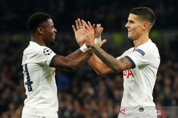 Pesepak bola Tottenham Hotspur Erik Lamela (kanan) melakukan selebrasi bersama rekannya Serge Aurier usai mencetak bol keempat untuk timnya saat melawan Re Star Belgrade, dalam laga babak lanjutan Group B Liga Champions, di Stadion Tottenham Hotspur, London, Inggrs, Selasa (22/10/2019). Tottenham mengalahkan tamunya Belgrade 5-0. ANTARA FOTO/Reuters -John Sibley/hp.