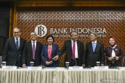 Gubernur Bank Indonesia (BI) Perry Warjiyo (ketiga kanan) didampingi Deputi Gubernur Senior BI Destry Damayanti (ketiga kiri) dan empat Deputi Gubernur BI Dody Budi Waluyo (kiri), Sugeng (kedua kiri), Erwin Rijanto (kedua kanan) dan Rosmaya Hadi (kanan) berfoto bersama usai menyampaikan keterangan pers tentang hasil Rapat Dewan Gubernur (RDG) BI bulan Oktober 2019 di Jakarta, Kamis (24/10/2019). RDG BI memutuskan untuk menurunkan BI 7-day Reverse Repo Rate (BI7DRR) sebesar 25 bps menjadi 5,00 persen, suku bunga Deposit Facility sebesar 25 bps menjadi 4,25 persen dan suku bunga Lending Facility sebesar 25 bps menjadi 5,75 persen. ANTARA FOTO/Galih Pradipta/ama.