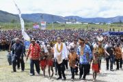 Presiden Joko Widodo (tengah) mengunjungi lapangan bola Irai di Kabupaten Pegunungan Arfak, Provinsi Papua Barat, Minggu, (27/10/2019). Presiden Joko Widodo dan Ibu Iriana menyapa dan bertemu ribuan warga yang berasal dari 10 distrik dan 162 desa dan disambut penampilan tarian Tari Tumbu Tanah yang merupakan tarian khas Suku Besar Arfak. ANTARA FOTO/Setpres-Kris/Lmo/aww.