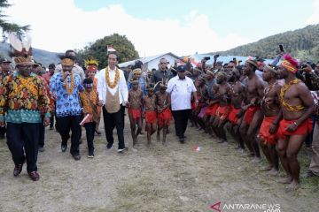 Presiden Joko Widodo (keempat kiri) dan Ibu Negara Iriana Joko Widodo (ketiga kiri) mengunjungi lapangan bola Irai di Kabupaten Pegunungan Arfak, Provinsi Papua Barat, Minggu, (27/10/2019). Presiden Joko Widodo dan Ibu Iriana menyapa dan bertemu ribuan warga yang berasal dari 10 distrik dan 162 desa dan disambut penampilan tarian Tari Tumbu Tanah yang merupakan tarian khas Suku Besar Arfak. ANTARA FOTO/Setpres-Kris/Lmo/aww.