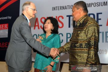 Chairman Indonesia Bureau of Economic Research (IBER) Mari Pangestu (tengah), menyaksikan Head of the East Asian Bureau of Economic Research (ABER) Peter Drysdale (kiri) menyalami Gubernur Bank Indonesia Perry Warjiyo, usai memberikan sambutan sebagai keynote speaker pada simposium internasional Asias Trade and Economic Priorities in 2020, yang diselenggarakan IBER, di Jakarta, Selasa (29/10/2019). Simposium diselenggarakan untuk membahas prioritas kebijakan ekonomi dan perdagangan Asia pada tahun 2020, termasuk resiko utama yang dihadapi, serta upaya-upaya yang dapat dilakukan untuk memperkuat ketahanan ekonomi dan sistem keuangan Asia tidak terkecuali melalui Forum G20. ANTARA FOTO/Audy Alwi/pras.