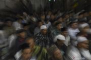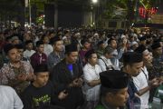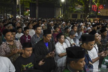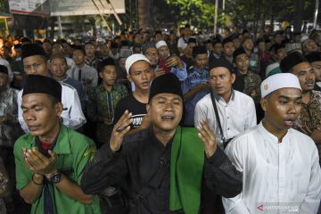 Warga muslim mengikuti Istighosah untuk Indonesia Aman dan Damai di halaman gedung PB Nahdlatul Ulama (NU) Jakarta, Rabu (30/10/2019). Istighosah tersebut diadakan untuk mendoakan Indonesia agar aman dan damai pasca Pemilu serentak 2019 serta Ijazah Kubro Hizib Nashor. ANTARA FOTO/Nova Wahyudi/hp.