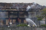 Petugas pemadam kebakaran berusaha memadamkan api yang membakar Istana Shuri, yang merupakan salah satu situs warisan dunia di Naha, Okinawa, Jepang, Kamis (31/10/2019) dini hari. ANTARA FOTO/Kyodo/via REUTERS /pras.