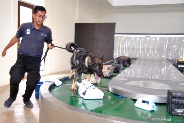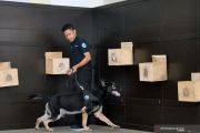 Petugas Badan Narkotika Nasional (BNN) menggunakan anjing pelacak K-9 untuk menemukan keberadaan narkotika saat simulasi di gedung fasilitas anjing pelacak narkotika (Unit Deteksi K-9) BNN, Lido, Kabupaten Bogor, Jawa Barat, Senin (4/11/2019). Unit Deteksi K-9 bertugas membantu BNN dalam mengungkap tindak pidana peredaran narkotika. ANTARA FOTO/Arif Firmansyah/foc.