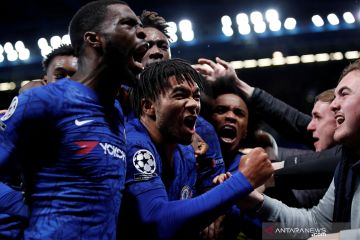 Pemain Chelsea Reece James merayakan gol bersama rekannya pada laga grup H Liga Champions melawan Ajax Amsterdam di Stamford Bridge, London, Inggris, Selasa (5/11/2019). Kedua tim bermain imbang 4-4. ANTARA FOTO/REUTERS/David Klein/aww.