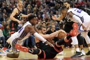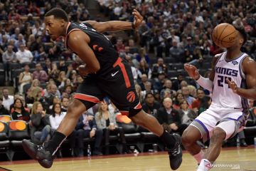 Pebasket Toronto Raptors Kyle Lowry (7) berupaya meraih bola yang keluar lapangan hingga mengenai pebasket Sacramento Kings Buddy Hield (24) dalam laga lanjutan NBA 2019/2020, di Scotiabank Arena, Toronto, Kanada, Rabu (6/11/2019). Raptors berhasli mengalahkan Sacramento 124-120. ANTARA FOTO/Reuters-Dan Hamilton-USA TODAY Sports/hp.