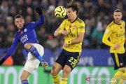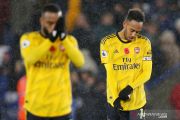 Pesepak bola Arsenal Pierre-Emerick Aubameyang (kana) terlihat kecewa setelah pertandingan usai saat melawan Leicester City dalam laga pekan ke-12 Liga inggris, di Stadion King Power, Leicester, Inggris, Sabtu (9/11/2019). Leicester berhasil mengalahkan Arsenal 2-0 dan menempati posisi kedua dalam klasmen sementara di bawah Liverpool. ANTARA FOTO/Reuters-Carl Recine/hp.Andrew Yates