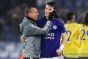 Pesepak bola Leicester City Caglar Soyuncu (kana) menerima pelukan dari Pelatihnya Brendan Rodgers user bertanding melawan Arsenal dalam laga pekan ke-12 Liga inggris, di Stadion King Power, Leicester, Inggris, Sabtu (9/11/2019). Leicester berhasil mengalahkan Arsenal 2-0 dan menempati posisi kedua dalam klasmen sementara di bawah Liverpool. ANTARA FOTO/Reuters-Carl Recine/hp.