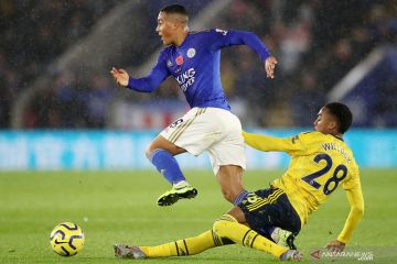 Pesepak bola Leicester City Youri Tielemans (kiri) berupaya menghindar dari penjagaan pesepak bola Arsenal Joe Willock dalam laga pekan ke-12 Liga inggris, di Stadion King Power, Leicester, Inggris, Sabtu (9/11/2019). Leicester berhasil mengalahkan Arsenal 2-0 dan menempati posisi kedua dalam klasmen sementara di bawah Liverpool. ANTARA FOTO/Reuters-Carl Recine/hp.