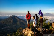 Sejumlah wisatawan menikmati pemandangan Gunung Merbabu (kiri) dan Gunung Andong (kanan) dari Gunung Telomoyo, Desa Sepakung, Banyubiru, Kabupaten Semarang, Jawa Tengah, Minggu (10/11/2019). Gunung yang memiliki ketinggian 1.894 mdpl itu menjadi salah satu destinasi wisata alam favorit bagi wisatawan domestik maupun mancanegara karena menawarkan pemandangan alam matahari terbit hingga tenggelam serta sejumlah gunung di antaranya yaitu Gunung Merbabu, Gunung Andong, Gunung Sindoro, Gunung Sumbing, dan Gunung Ungaran. ANTARA FOTO/Aji Styawan/hp.