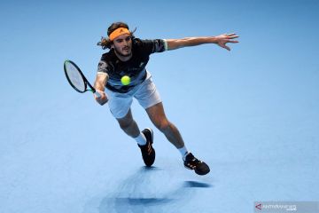 Petenis Yunani Stefanos Tsitsipas mengembalikan bola ke arah petenis Jerman Alexander Zverev pada pertandingan ATP Finals di The O2, London, Rabu (13/11/2019). Tsitsipas kalahkan juara bertahan Zverev dengan skor 6-3,6-2. ANTARA FOTO/Action Images via Reuters/Tony O'Brien/pras.