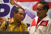 Menpora Zainudin Amali (kiri) berbincang dengan Deputi Bidang Pembudayaan Olahraga Kemenpora Raden Isnanta (kanan) saat memberikan keterangan pers terkait agenda olahraga yang akan dihadapi Indonesia di Kemenpora, Jakarta, Kamis (14/11/2019). Menpora menjelaskan tentang pelaksanaan Pekan Olahraga Pelajar Nasional (POPNAS) yang akan diselenggarakan di Jakarta dan kesiapan kontingen Indonesia di Sea Games 2019 Manila serta kesiapan Indonesia sebagai tuan rumah Kejuaraan Sepakbola Pelajar tingkat Asia (ASFC) di Balikpapan pada 15-25 November 2019. ANTARA FOTO/Nova Wahyudi/hp.