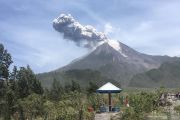 Letusan Gunung Merapi terlihat dari bungker Kaliadem, Cangkringan, Sleman, DI Yogyakarta, Minggu (17/11/2019). Gunung Merapi meletus pada pukul 10.46 WIB dengan tinggi kolom 1000 meter, status Waspada. ANTARA FOTO/Rudi/pras.