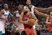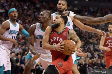 Pebasket Toronto Raptors Fred VanVleet (23) membawa bola dan berupaya melepaskan dirt dari penjagaan pebasket Charlotte Hornets Bismack Biyombo (8) dalam laga lanjutan NBA, di Scotiabank Arena, Toronto, Ontario, Kanada, Senin (18/11/2019). Raptors berhasil menang atas Hornets 132-96. ANTARA FOTO/Reuters-Dan Hamilton-USA TODAY Sports/hp.