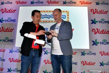 Group Head Home Business XL Axiata Robert Edward Langton (kiri) mendapat penjelasan dari Deputy CEO Vidio Hermawan Sutanto di Jakarta, Jumat (22/11/2019). XL Axiata terus melanjutkan pengembangan bisnis layanan fixed broadband/fiber broadband XL Home dengan memperkaya konten layanan premium yang bisa dinikmati para pelanggan PT Vidio Dot Com yang merupakan penyedia layanan video streaming online dengan brand Vidio. ANTARA FOTO/Sigid Kurniawan/hp.