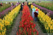 Pengunjung menikmati suasana di objek wisata kebun bunga "Rainbow Garden" di Kecamatan Somba Opu, Gowa, Sulawesi Selatan, Minggu (24/11/2019). Kebun bunga tersebut menjadi salah satu destinasi menarik di daerah itu yang banyak dikunjungi wisatawan untuk berswafoto dengan tarif masuk Rp10 ribu per orang. ANTARA FOTO/Arnas Padda/YU/hp.