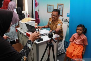 Petugas Disdukcapil melakukan perekaman data seorang anak untuk pembuatan Kartu Identitas Anak (KIA) pada program jemput bola pembuatan KIA oleh Disdukcapil Kota Tangerang Selatan di Pondok Cabe, Tangerang Selatan, Banten, Senin (25/11/2019). Pemerintah Kota Tangerang Selatan menargetkan pada tahun 2020 semua anak warga Tangerang Selatan sudah memilik KIA yang nantinya akan menjadi kelengkapan administrasi kependudukan dalam mengurus segala hal. ANTARA FOTO/Muhammad Iqbal/hp.