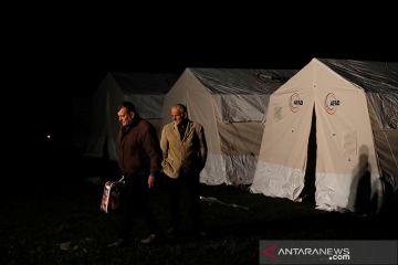 Para penyintas berjalan melewati tenda-tenda yang didirikan oleh Organisasi Manajemen Bencana dan Darurat Turki (AFAD) setelah gempa bumi bermagnitudo 6,0 Selasa, di Thumane, Albania, (27/11/2019) dini hari waktu setempat. ANTARA/REUTERS/Florion Goga/aa.