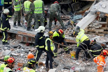 Personel tanggap darurat bekerja di lokasi sebuah bangunan yang runtuh di kota Durres, setelah gempa bumi bermagnitudo 6,0 Selasa, di Thumane, Albania, (27/11/2019) waktu setempat. ANTARA/REUTERS/Florion Goga/aa.