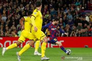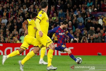 Pesepak bola Barcelona Lionel Messi (kanan) menendang bola ke arah gawang Borussia Dortmund dan berhasil membuat gol kedua untuk timnya dalam laga match day kelima Group F, Liga Champions, di Stadion Camp Nou, Barcelona, Spanyol, Rabu (27/11/2019). Barcelona mengalahkan Dortmund 3-1 dan berhak melaju babak 16 besar Liga Champions. ANTARA FOTO/Reuters-Albert Gea/hp.
